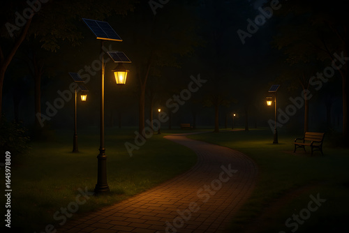 Path of Enlightenment: A serene, softly lit path winds through a tranquil park at night, with ambient streetlights illuminating the way.