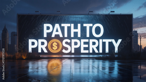 "Path to Prosperity" text on glowing billboard with dollar coin symbol during rainy evening