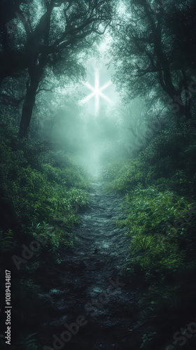 Pathway Illuminated by Light in a Deep, Dense Forest Surrounded by Mystical Foliage