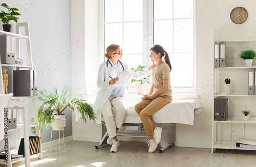 Patient consulting with a female doctor or nurse at the hospital, receiving medical advice and support. Healthcare setting emphasizes the commitment to well being and professional medicare assistance.