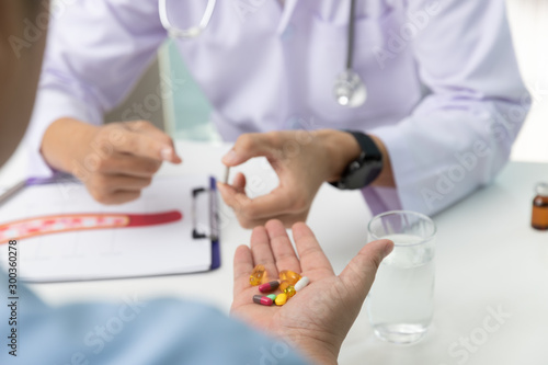 Patient holding medicine pills in hand and listening to doctor explained medication to patient