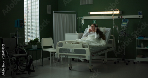 Patient lies in a hospital bed, enjoying audio content with her headphones.