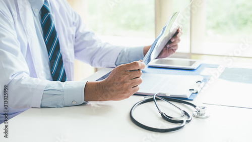 Patient listening intently to a male doctor explaining patient symptoms or asking a question as they discuss paperwork together in a consultation
