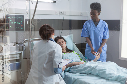 Patient resting in bed during recovery consultation while medical team monitoring sick woman analyzing sickness symptom writing on clipborad disease treatment working in hospital ward