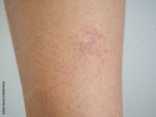 Patients with thrombocytopenia until the bleeding under the skin as red blood spots spot on the leg. closeup photo, blurred.