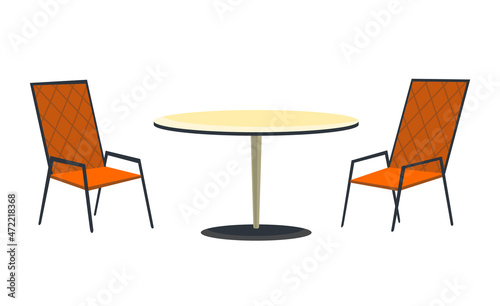 Patio area. Cafe and garden furniture table and chairs isolated on a white background. Summer outdoor meet place. Coffeehouse or restaurant open area