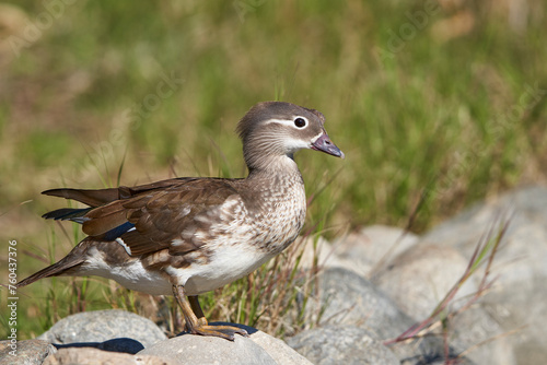 pato mandarín hembra en el estanque (Aix galericulata)