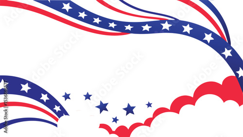 Patriotic design with red and blue stripes, white stars and cloud shapes on a white background