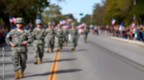 Patriotic scene with hand-held American flags at a military parade, soldiers marching in formation