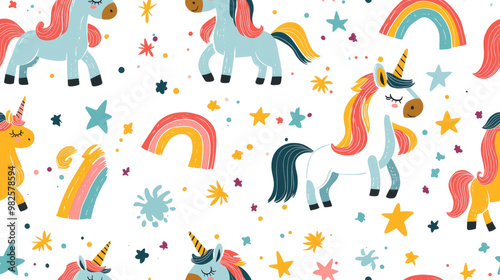 pattern. Delightful vector design showcases cute unicorns in various colors surrounded by stars, rainbows, and whimsical sparkles, creating a charming and vibrant pattern.