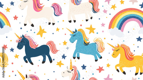 pattern. Delightful vector design showcases cute unicorns in various colors surrounded by stars, rainbows, and whimsical sparkles, creating a charming and vibrant pattern.