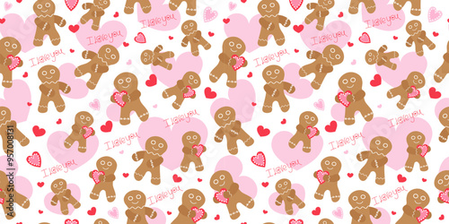 Pattern. Gingerbread men with a heart, a couple in love. Food, baking. Hand lettering I love you. Heart shape, love. Valentine's Day. Seamless background.