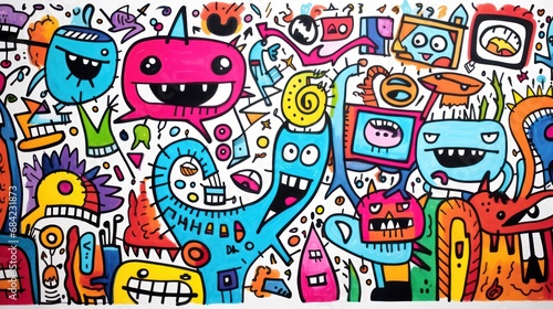 Pattern of a group of colorful faces, a frame made of childish doodles with thick, kids coloring