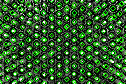 Pattern of metal tubes, hexagons, square elements and glass surfaces