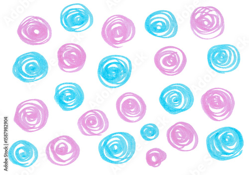 Pattern of pink and blue circles isolated on white background. Circles of different sizes and shapes. Consist of lines twisted in a spiral. Chaotically placed. Marker drawing. Baby shower.