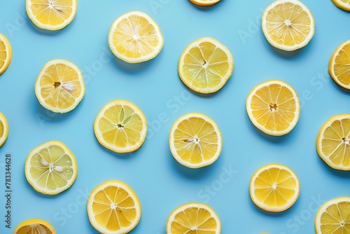 Pattern of ripe lemon slices on blue background