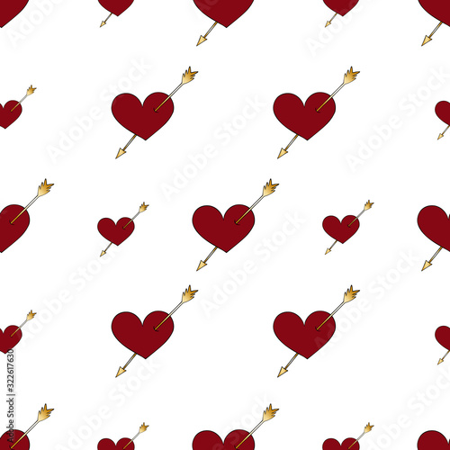 Pattern of scarlet hearts pierced by an arrow. Love symbol on an isolated background. Romantic ornament. The idea for the cover, Wallpaper, fabric, case. Vector. Valentine day, wedding. Holiday print.