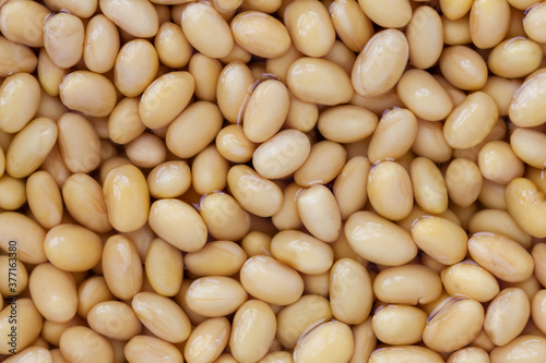 Pattern of soybean in water. Wet seeds background food close-up. Soy milk preparation.