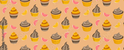 Pattern with chocolate and caramel cupcakes with citruses. Lemon, lime, grapefruit.