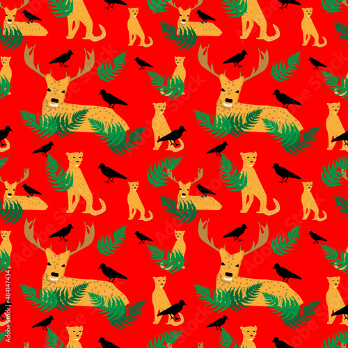 Patterns depicting a male deer, a silhouette of a raven and a forest fern. Seasonal design on a red background. For printing and printing on paper or fabric, stationery, book products.
