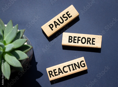 Pause before Reacting symbol. Concept words Pause before Reacting on wooden blocks. Beautiful deep blue background with succulent plant. Business concept. Copy space.