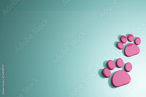 Paw 3d symbol. Pet paw 3D rendering illustration. pink Paw print icon isolated on blue background. Dog or cat paw print. Animal track. Minimalism concept. 3d illustration 3D render.