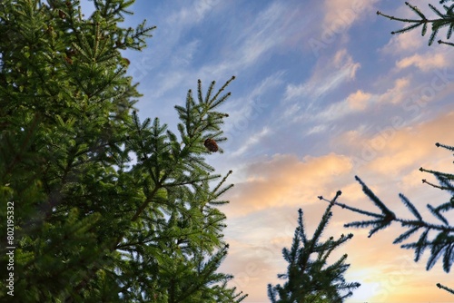 Paws of a green spruce with cones against the background of the sunset sky.