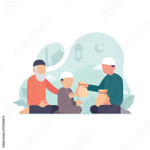 Pay Zakat Al-Fitr at the end of the month of Ramadan. Muslim people giving donation and charity flat style vector illustration