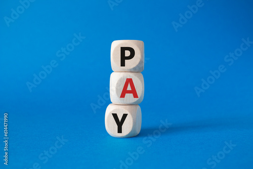 Payment symbol. Wooden cubes with words Pay. Beautiful blue background. Business and Pay concept. Copy space.