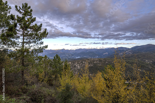 Paysage de montagne avec de grands pins et des sommets enneigés des Alpes du Sud