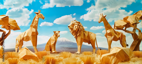paysage de savane en origami avec animaux sauvages : Lions et girafes