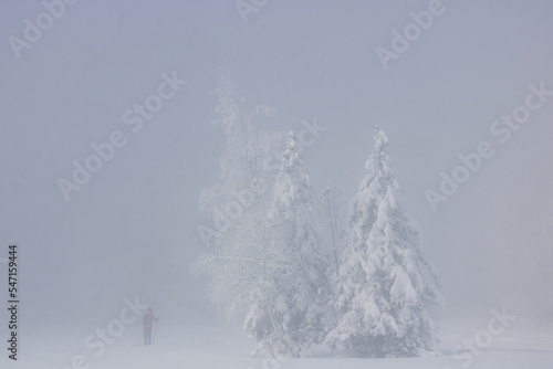 paysage hivernal: silhouette d'un skieur, neige et brume