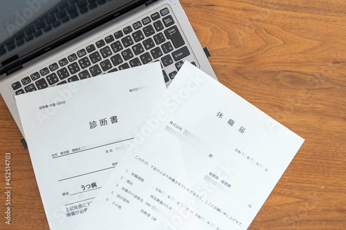 ノートブックPCに置かれた病気療養のための休職届と診断書(左)