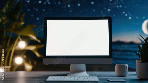 Pc monitor mockup in evening home office. Radiating coziness workplace with computer display template advertising image. Device screen mock up on desk product photorealistic