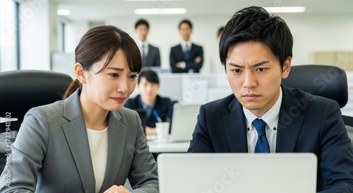ウイルス・ランサムウェアに感染したPCの前で泣き出しそうな日本人女性社員と、非常に真剣な表情で対応している日本人男性IT担当社員
