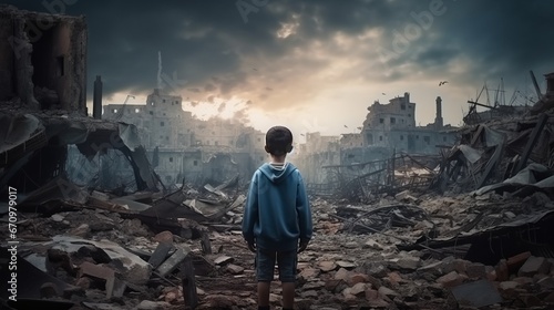 Peace crisis concept, front of collapsed buildings, area war victim, sorrowful scenery idea for support children's right