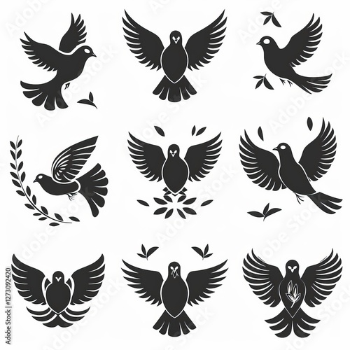 Peace dove graffiti, pigeons, twigs ink illustration. Flying birds silhouettes monochrome flat icons