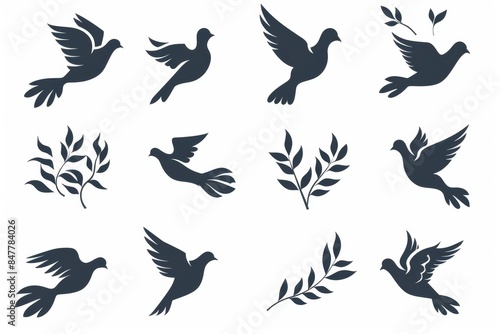 Peace dove graffiti, pigeons, twigs ink illustration. Flying birds silhouettes monochrome flat icons