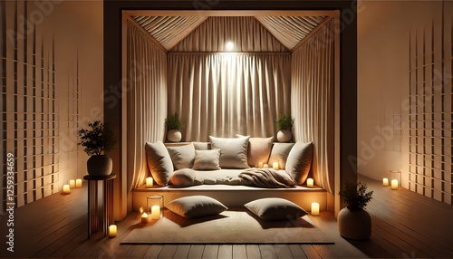 peaceful and inviting alcove designed for meditation or yoga, featuring soft pillows arranged on a comfortable rug. Generative AI