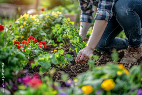 Peaceful backyard scene with a person tending to a garden, planting flowers, watering plants, and pulling weeds. The lush, green garden features colorful flowers and a vegetable patch.