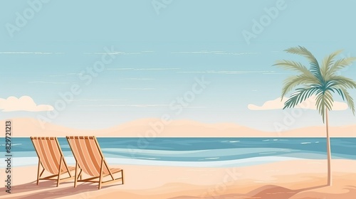 Peaceful beach scene with two wooden chairs under a palm tree, overlooking a serene ocean and a clear sky.