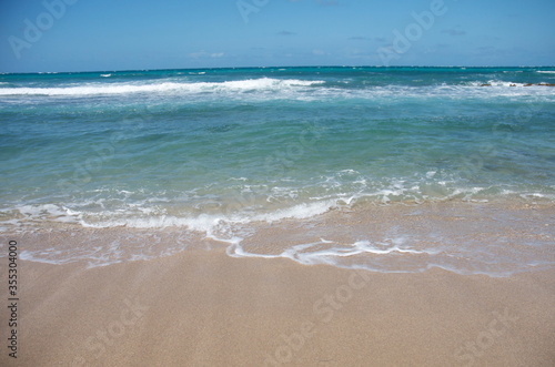 Peaceful blue water and ocean waves roll in on a shallow beach with taupe-colored sand and frothy white residue.. Lots of room for vacation dialog text.