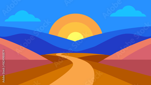 Peaceful Cartoon Sunrise Over Layered Blue Hills with Soft Morning Glow