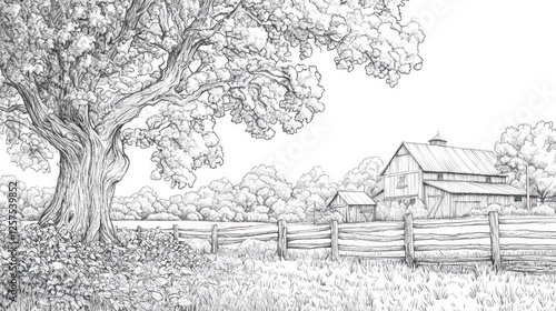 Peaceful countryside barn, tree, fence, field sketch; coloring book page