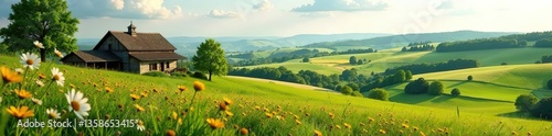 Peaceful countryside scene with rolling hills, wildflowers, and a rustic farmhouse, farmhouse, green