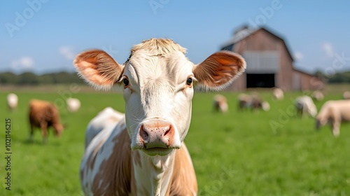 Peaceful farm animals including cows sheep or goats grazing in a lush green open pasture or meadow with a traditional countryside barn or farmhouse in the background