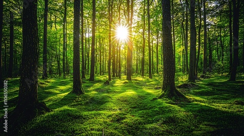 Peaceful forest landscape with sunlight streaming through the trees creating a lush serene atmosphere with a calming natural ambiance