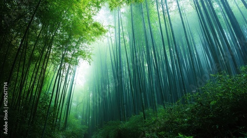 Peaceful Giant Bamboo Forest with Mist Rolling Through Landscape