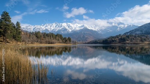 Peaceful Himalayan lake reflecting snow-capped peaks near ABC, still waters, no people