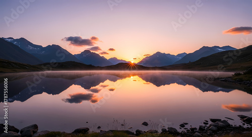 Peaceful lake with sunrise reflection and mountains